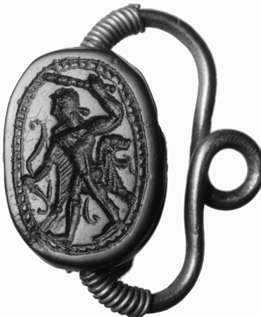 32/X14 Carthage no. 675. Quillard, no. 58, pl. 6b. Cornelian, in gold mount. BH. Wrestles lion on ground.