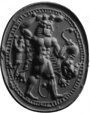 32/X10 Sternberg, Aukt. 25 (1991) no. 673; Syria 76 (1999) 263, fig. 38. Black serpentine. BH. A dog behind.