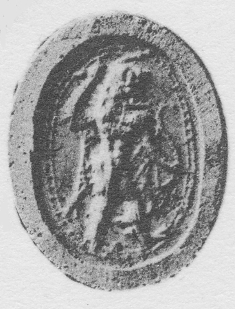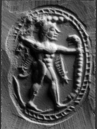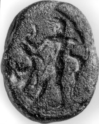 32/X2 Jerusalem IAA 32.552, from Atlit. QDAP 2 (1933) no. 552; AJBA 1 (1968) pl. 1.9 (Culican); CSAPI no. 8. Cornelian. BL. Walking with lionskin, bow, raised club. Aramaic inscription. III