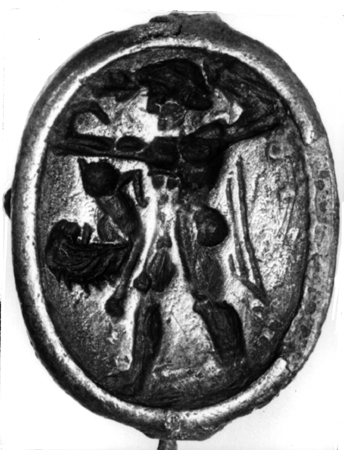 32/X16 Péronne, Danicourt Coll. RA 1971, 197, fig. 4 (Boardman). Mottled quartz. BH. As the last but the victim is a warrior with helmet, shield and spear.
