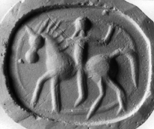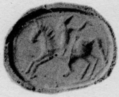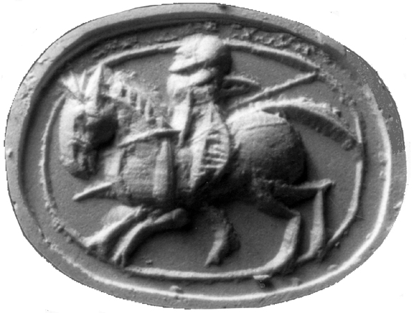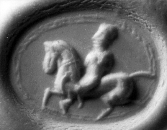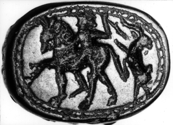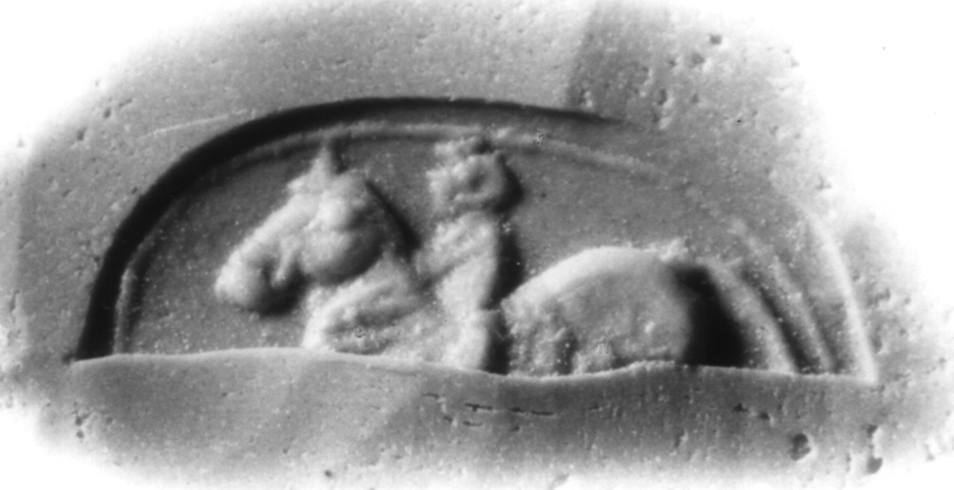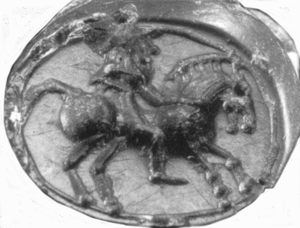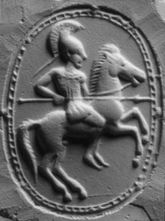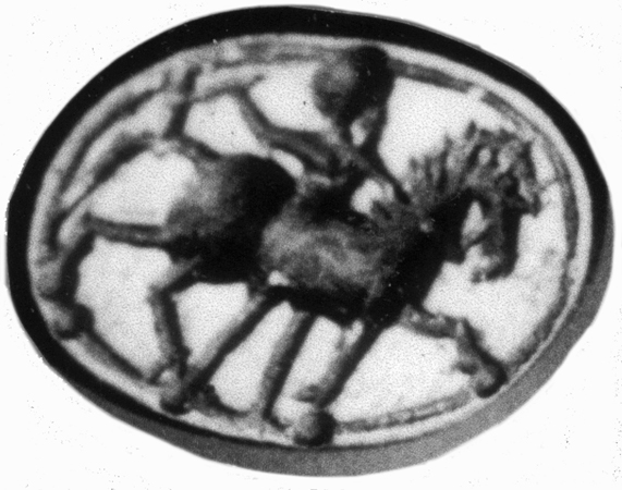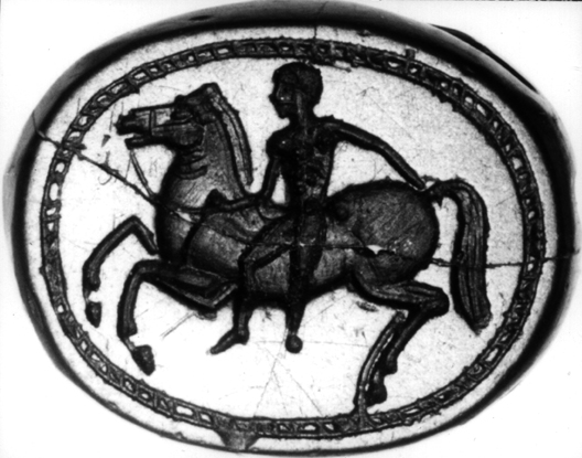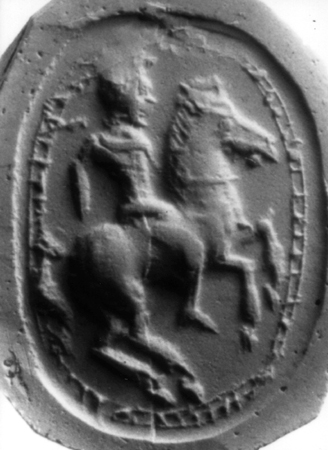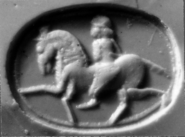 The subject is not a common one on Greek scarabs. It is not always clear whether the male is riding or standing beside the horse, as trainer. Few are armed. Cf. the frontal horseman with a warrior (28/131). For the subject, G. Pisano in Alle soglie della classicità (Studi Moscati) II (1996) 917-924.