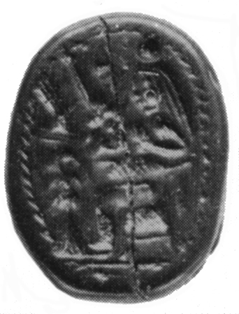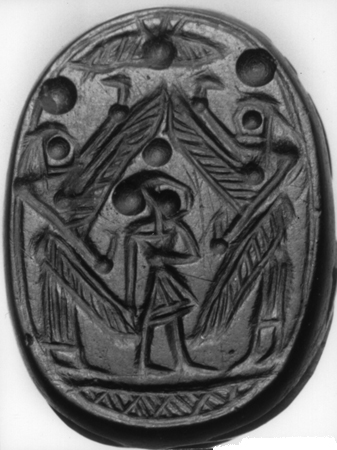 11/13 Palermo, from Palermo, T.248. ArchClass 20 (1968) pl. 131.1,2; RSF 14 (1986) pl. 25.2 (Verga). BL;EXCR; scarab with spine. Horus with disc crown; incense-burner; attendant behind; above, disc-and-crescent and winged disc. II