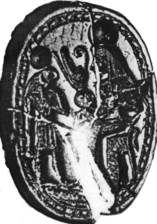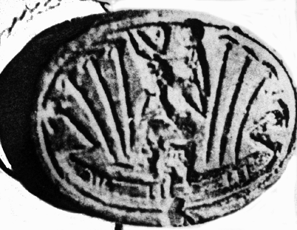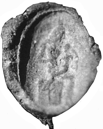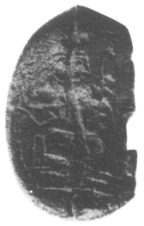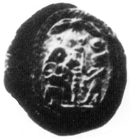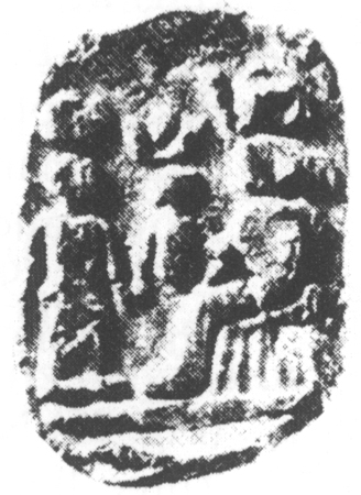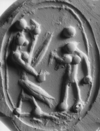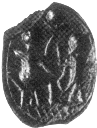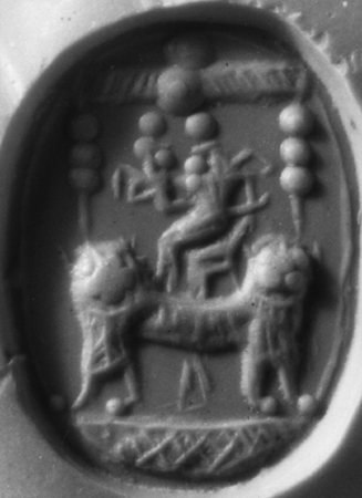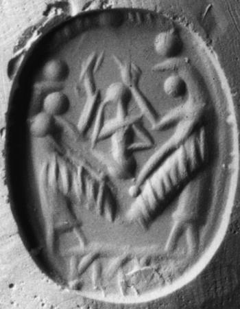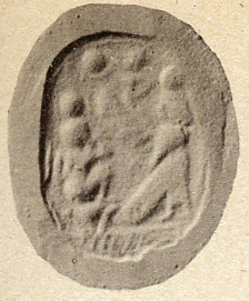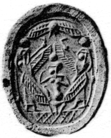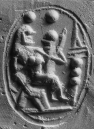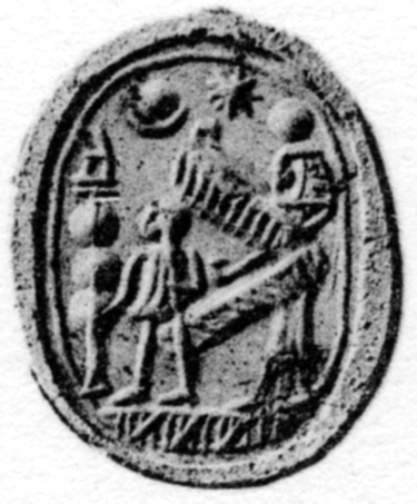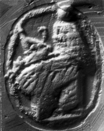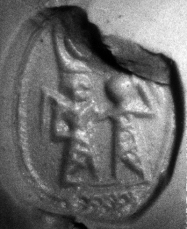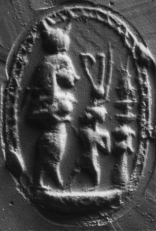 11/X29 Nicosia, from Kition. Kition II, no. 516; Gubel, Furn no. 120; Reyes, fig. 27a. Clay bulla. Disc-crowned figure in front.