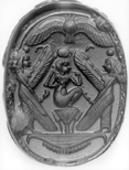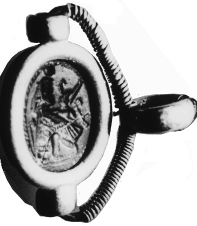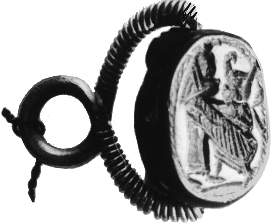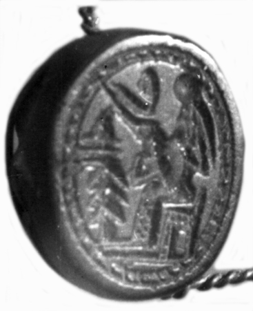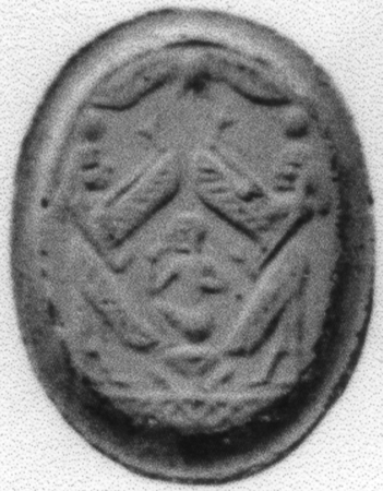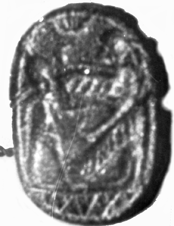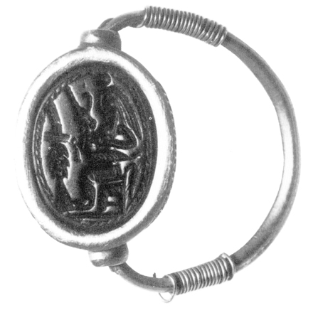 11/X8 London no. 273, pl. 5; LRings no. 284. Sard. BL;EXCR; on a gold mount with wavy wire sides and hoop A. Osiris at either side; winged disc above.