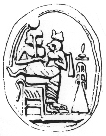 11/X23 Karam Coll., Beirut, clay bulla. AJBA 1 (1968) pl. 2B (Culican); Gubel, Furn no. 73. BH;EXnb. Before incense-burner and attendant holding khnum sceptre and jug; disc-and-crescent and winged disc above.