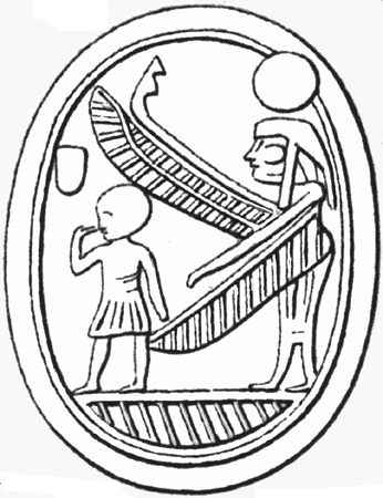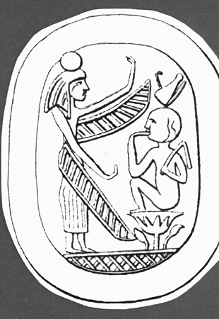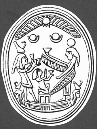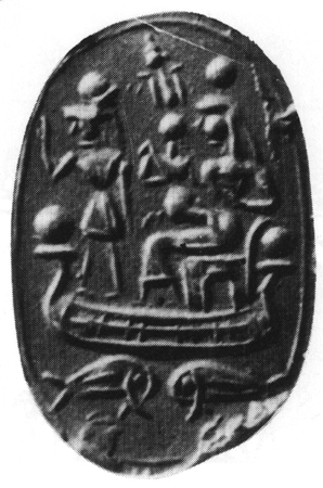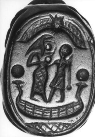 11/X30 New York, Met.Mus. 74.51.4140, from Kourion. Gubel, Furn no. 83. Chalcedony. BH; in gold hoop. On a boat with papyrus and bird terminals; between disc-crowned figures, one with hawk head.