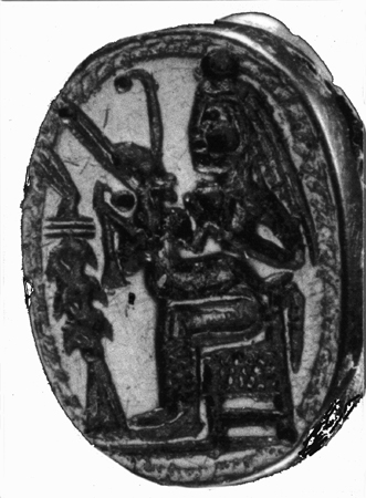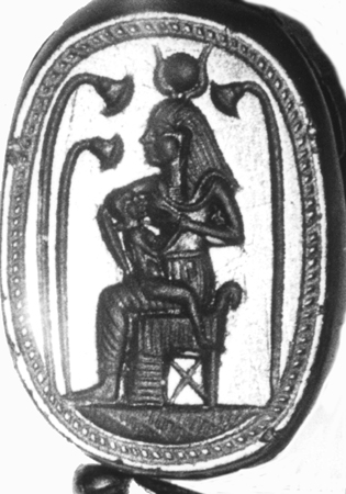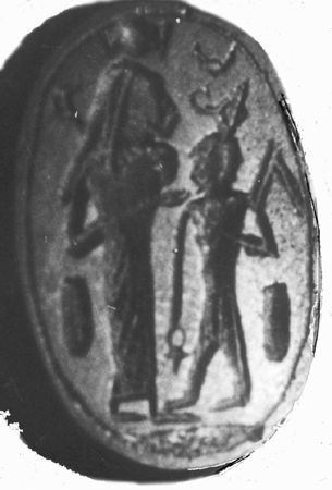 11/32 Spano Coll., from Tharros. Marmora pl. A 43; Hölbl, Sard no. 29. BL;EXCR. Holds feathers (?); faces Horus squatting on lotus with buds, double-crowned. II/VI
