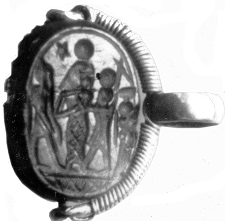 11/23 Ibiza no. 41 (Madrid 36543). BL;EXnb; on silver hoop C. Two figures of Isis, holding flowers; between them Horus squatting on lotus; winged disc above. V