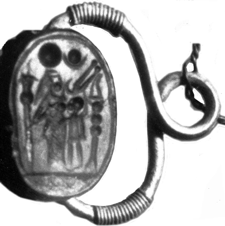 11/20A London, V&A 409-1871; Oman no. 9. BL.EXCR; on gold hoop A. Two figures, one with double crown and flail. II/VI