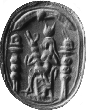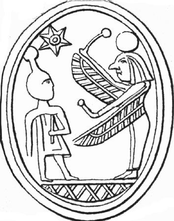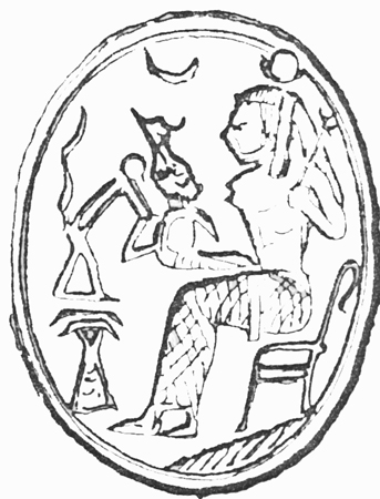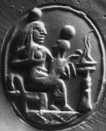 11/34 Sassari 2878, Chessa Coll. Ebers, pl. F 1; RendVat 51/2 (1982) 302, fig. 11 (Moscati); Hölbl, Sard no. 30. BL;EXCR. Holds flowers, facing Horus squatting on lotus with buds, disc-crowned; disc-and-crescent and star (?) above. II