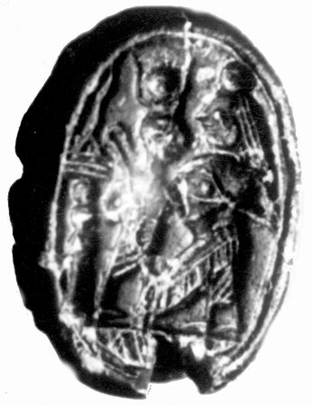11/X44 Geneva III, no. 125. Agate. BL;EXCR. Horus squats between figures with one wing down.