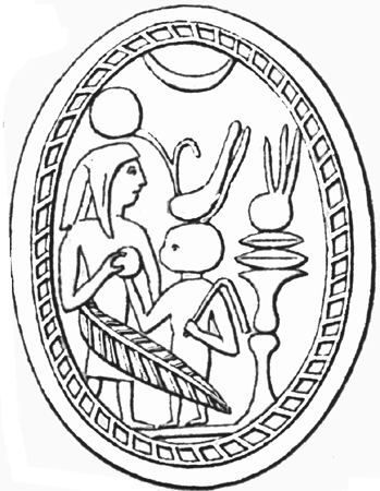 11/18 Paris, Louvre Bj. 1205. BL;EXCR; on gold hoop. Horus with uraei-disc crown; behind him an attendant; disc-and-crescent above. II