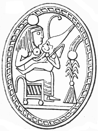 11/19 Geneva I, no. 155, pl. 63. BL;EXCR. Ibis-headed figure behind Isis; Horus suckles; incense-burner behind him; disc-and-crescent and winged disc above. II/VI