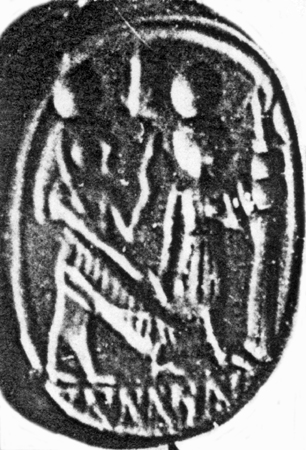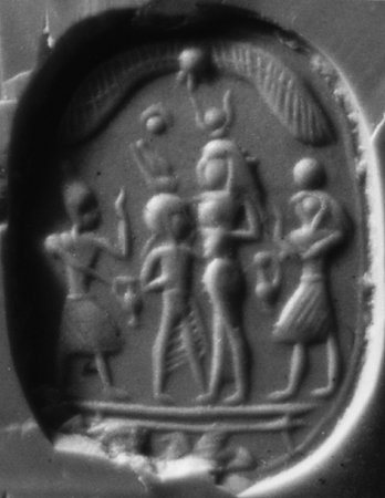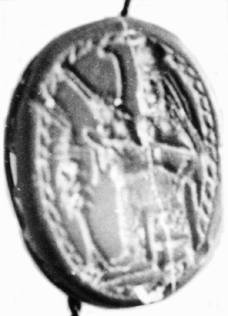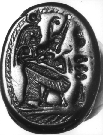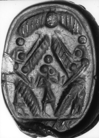 11/X9 Sternberg, Aukt. 25 (1991) no. 674; Syria 76 (1999) 264, fig. 39. 'Black agate'. BL;EXCR. At the sides an incense-burner, and a figure with pointed cap holding a jug; winged disc above.