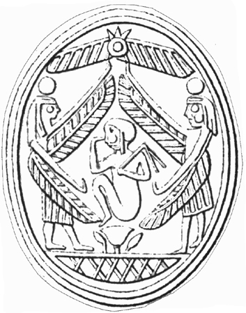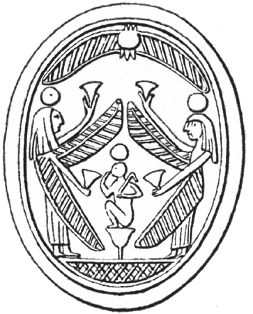 11/X37 S. Carta Coll., from Tharros. Marmora, pl. A 41; Hölbl, Sard no. 32. BL;EXnb. Cornelian. Holding flowers; between them Horus squatting on a lotus; winged disc above.between.