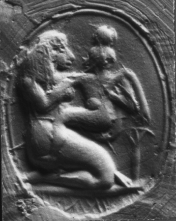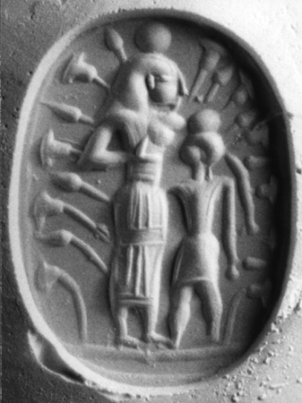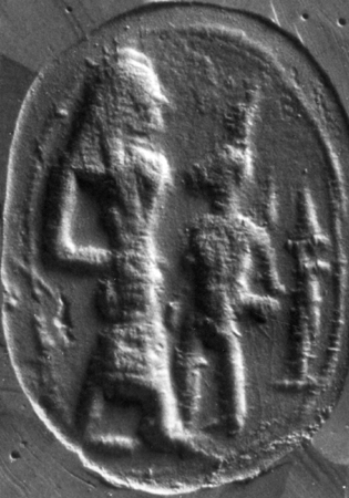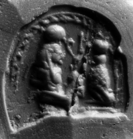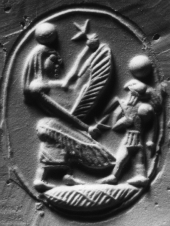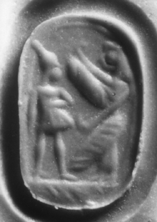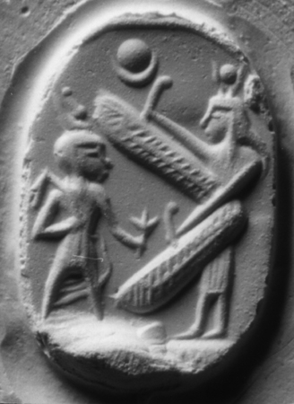 11/52 Koch Collection. A.B. Chadour, Rings 1 (1994) no. 34. BL;EXV. Faced by kneeling disc-crowned figure with raised hands.