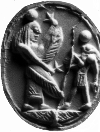 11/30 S. Carta Coll., from Tharros. Marmora, pl. A 39; Hölbl, Sard no. 44. BL;EXX. Holds a feather, faces a small figure, hand to mouth (Horus) facing away.