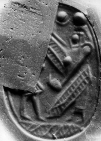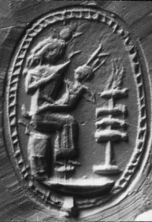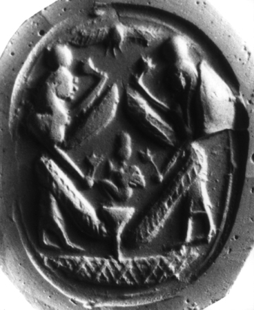 11/109 Impression, once Seyrig. AJBA 1 (1968) 70, pl. 3.5 (Culican); Gubel, Furn no. 125; Nunn no. 8. BH;EXO. Horus with double crown; incense-burner. II/VI