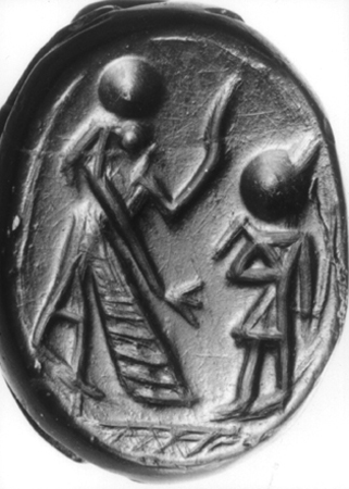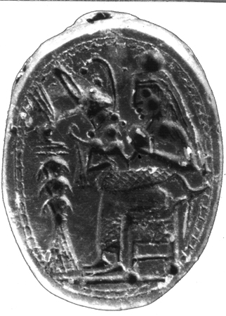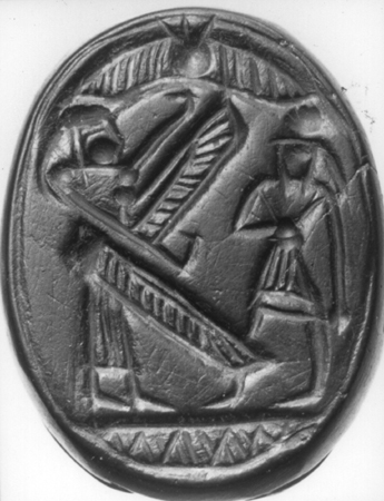 11/16 Oxford III, no. 16, from Al Mina (Level 4; 1937.778). Nunn no. 3. BL;EXCR. A hawk-headed attendant watches. VI
