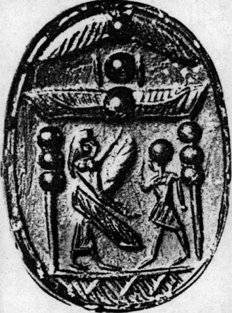 11/27 S. Carta Coll., from Tharros. Marmora, pl. A 42; Hölbl, Sard no. 48. BL. On a boat with female head finials, double-crowned. The goddess holds a flower facing a kneeling adorant on a base and a standing bearded adorant, holding three cups, red-crowned; two disc-and-crescents above and a winged disc. II/VI