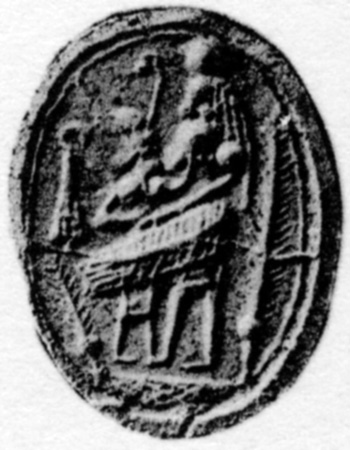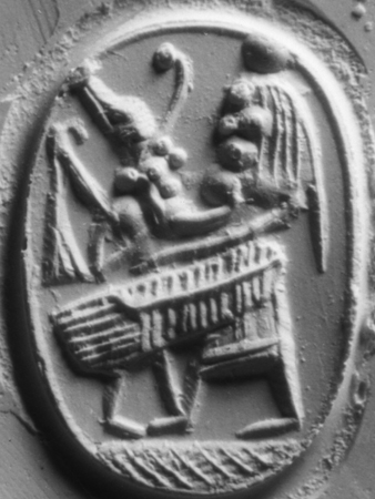 11/X4 Karthago III, no. 50. Clay bulla. With an attendant (Sekhmet?) and small seated figure, on a boat.