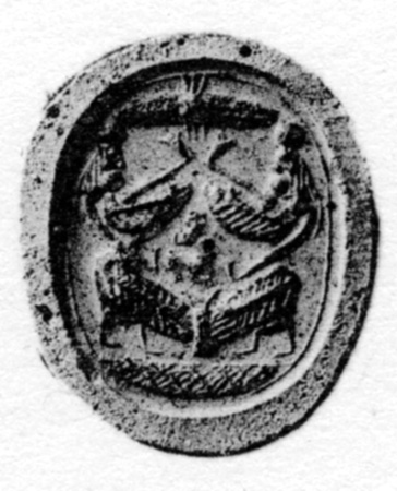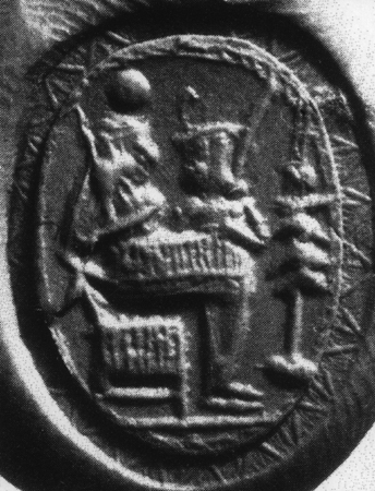 11/17 Paris, Bibl.Nat., de Clercq no. 2735, pl. 18. BL;EXCR. Standing on a boat with disc-crowned floral terminals; winged disc above. II/VI