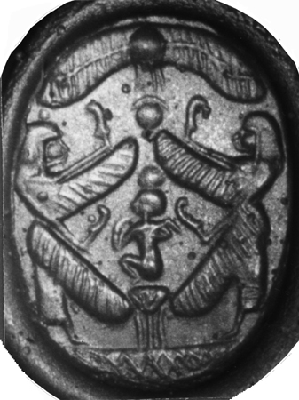 11/X39 Oxford III, no. 471 (1889.420), from near Beirut. Grey chalcedony. BL. Holding feathers; between them Horus, disc-crowned, squatting on lotus with buds, over nbw; winged disc above.