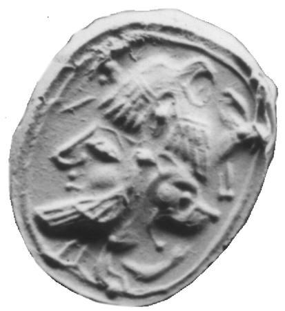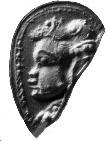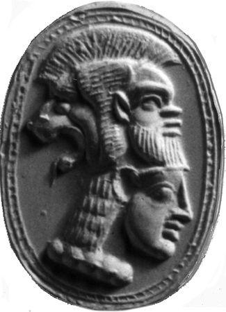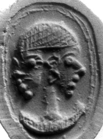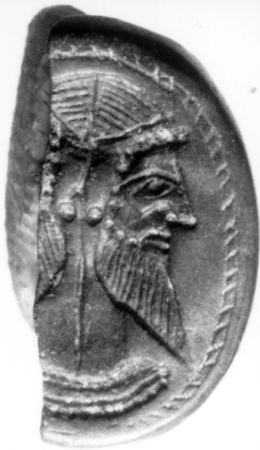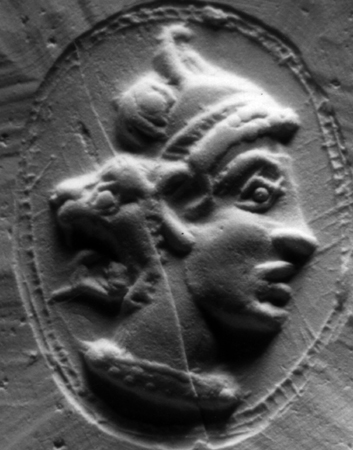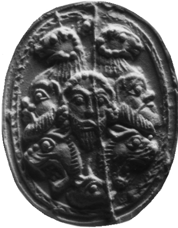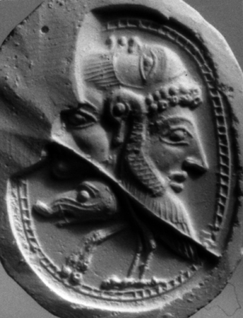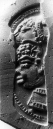 37/28 London, no. 321, pl. 6, from north of Tell Defenneh (Egypt). Zazoff, pl. 22.6. Fragment. BH. Bearded head with lion head helmet; below, a hatched area with hooks - watery? I