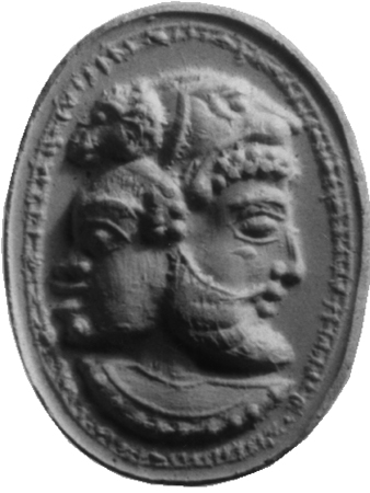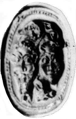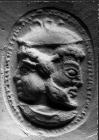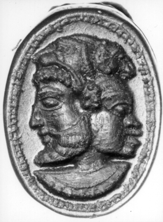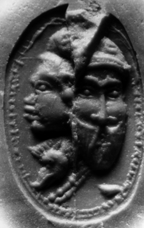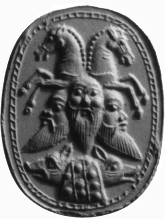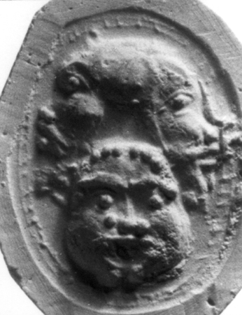 37/20 Oxford III, no. 490 (Fortnum G 20), from Tharros. BH;PB. Janiform bearded head and African head; above, lion and ram heads; below, cavetto base? I
