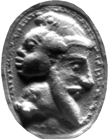 37/X3 Karthago II, no. 414. Clay bulla. In mount. Lion head, youth's head; above?