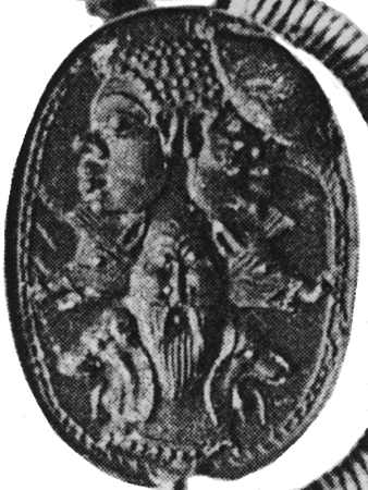 37/13 Cagliari 19872 (Busacchi, BAS 10, 91), from Tharros. OrAnt 18 (1979) pl. 17b. BH; on gold hoop C. Janiform African heads, boar heads, lion heads; centrally, facing bearded bald head. I