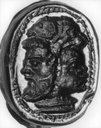 37/14 Cagliari 19871, from Tharros. AG pl. 15.88; OrAnt 18 (1979) pl. 17.1a. BH; on gold hoop C. Above, ram head, lion head; two facing heads, one bearded; below, eagle head?, boar head. I