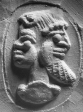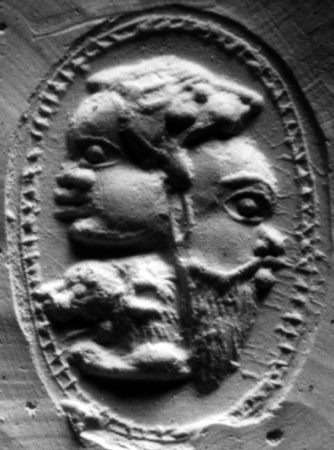 37/32 Sotheby, 11.7.1966, no. 200. BH. Bearded head, its beard a whole bird; above, a satyr head, behind, a African head and boar forepart. Compare London no. 428.