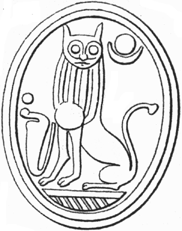 38/12 Sassari, Mus. Sanna 2850 (Chessa), from Sardinia. Ebers, pl. H 85; RendVat 51/2 (1982) 302, fig. 1 (Moscati); Hölbl, Sard no. 237; Along the Routes 78. BL;EXnb. Forepart of Bes behind, holding tail; double-crowned uraeus in front; star above. III