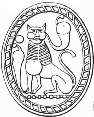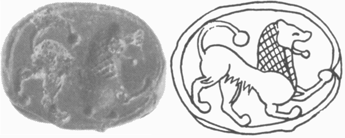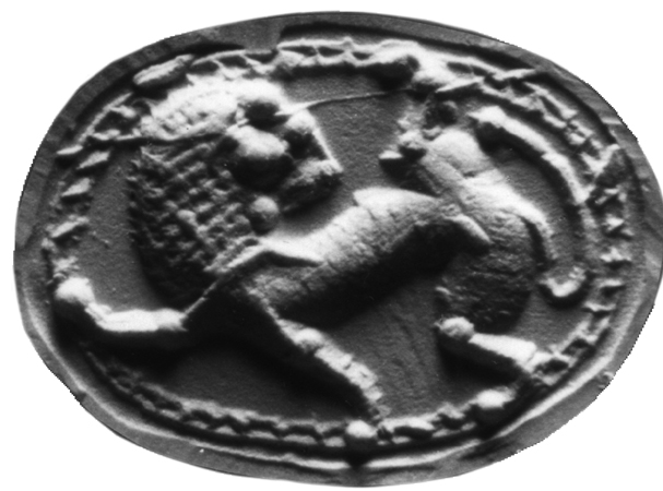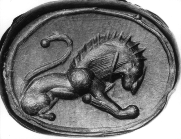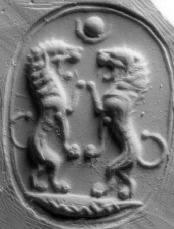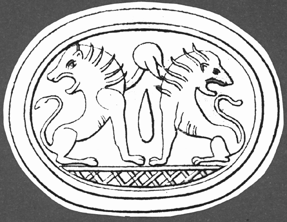 38/26 Visc. Asquer Coll., from Tharros. Marmora, pl. B 68. BL;EXCR. Two lions, paws raised, heads averted.