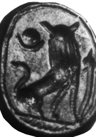 38/8 Cagliari 371, from Tharros. Anecd pl. 24.B3; Hölbl, Sard no. 238. BH;EXnb. Lion forepart behind; star and disc-and-crescent above; double-crowned uraeus in front. I