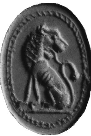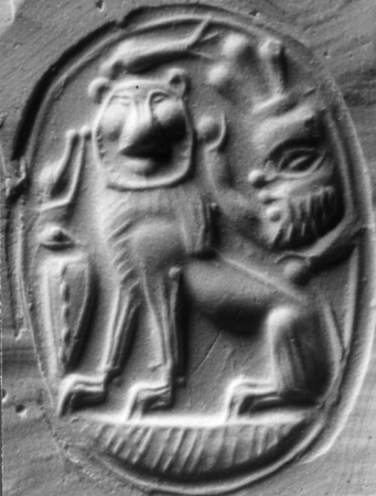 38/22 London no. 280, pl. 5 (BM ANE 103306), 'from Byblos?'. Tassie, no. 68; AG pl. 7.34; Biblo pl. 5.16 (Gubel); RSF 8 (1980) pl. 4.6 (Bisi). BL;EXnb. Double-crowned uraeus in front; Bes upper part behind holding lion's tail; letter (?) above. I