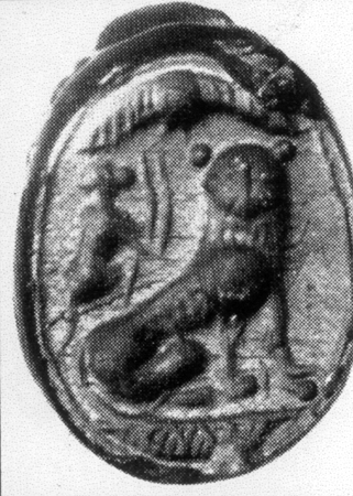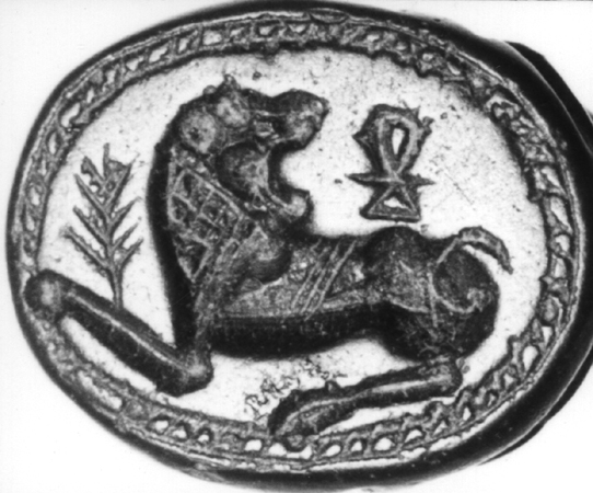 38/X8 Cagliari 9589 (Spano 79), from Tharros. Ebers, pl. G52; Hölbl, Sard no. 241. Cornelian. BH; EXnb. Recumbent; a large palm tree in the background.