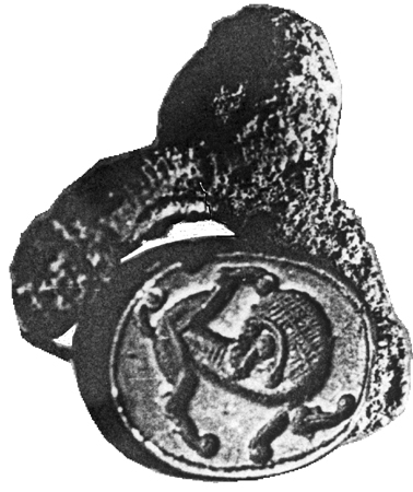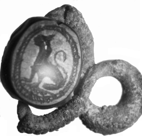 38/X11 London no. 419, pl. 7, from Sardinia; LRings no. 1007. Cornelian. BH; on gold mount with wavy wire sides on a massive silver hoop A, with a knob within the hoop.