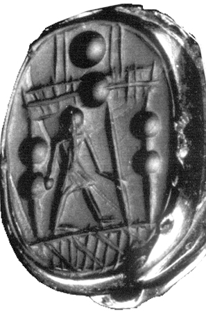 3/2 Paris, Bibl.Nat., de Clercq no. 2753, pl. 18, from Tyre. Nunn no. 26. BL;EXCR. Striding standing figure with pointed hat holding staff before burner; columns with triple disc capitals; lintel with winged disc, horns? and disc above. VI