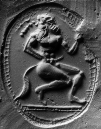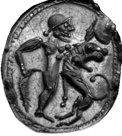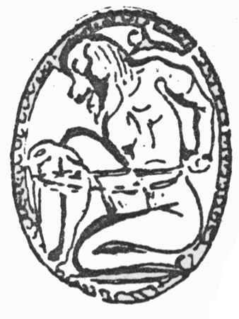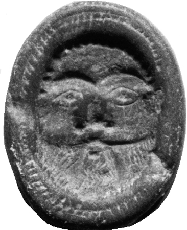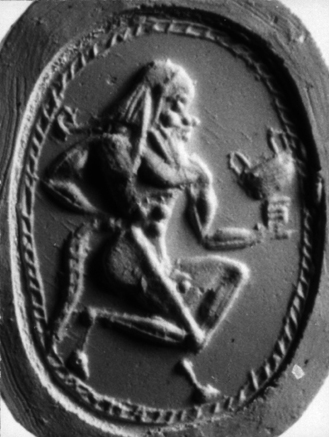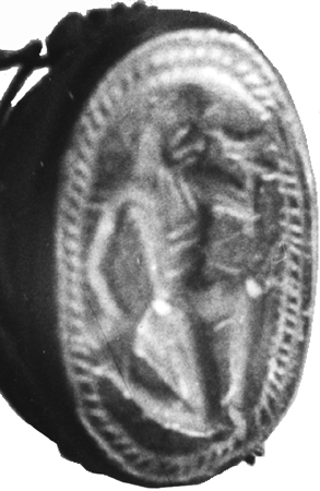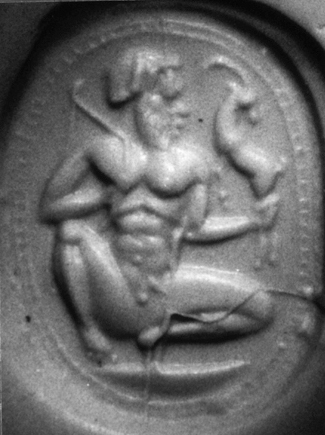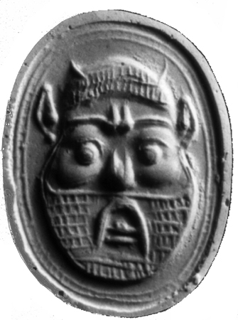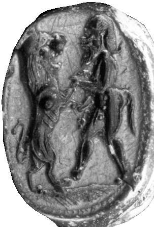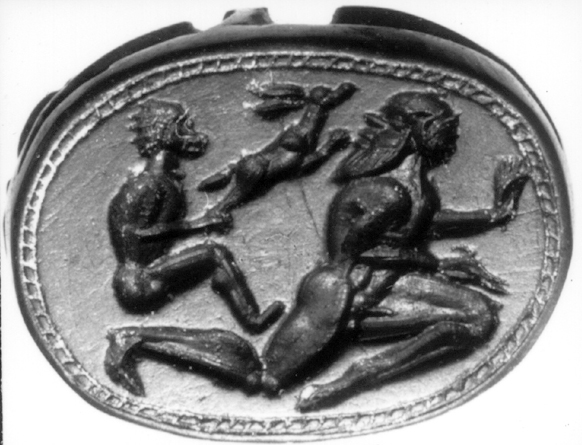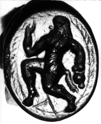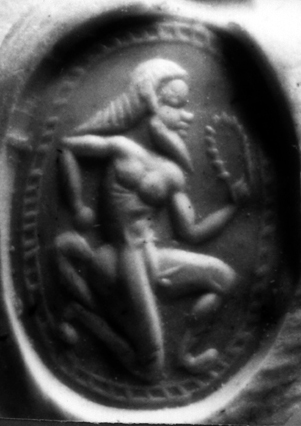The subject derives from its treatment in Greek late archaic glyptic, in terms of physique, pose and attributes. The head appears also in some of the joined-head compositions, and two flank a footprint (1/4). The tail is omitted in some versions which are not quite normal in Greek terms, having intimations of hunting, or the addition of a monkey, which may also intrude on otherwise Greek-style subjects (as AGGems no. 424, pl. 30).