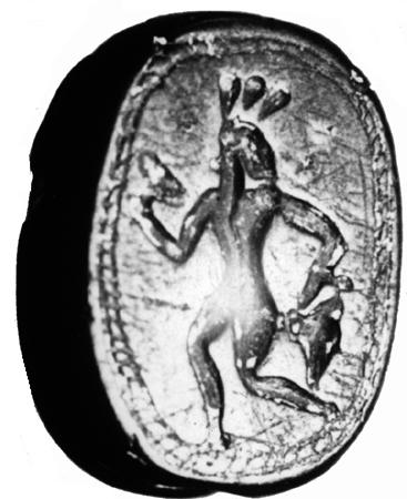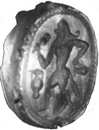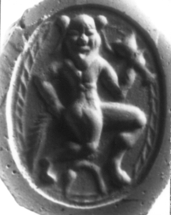 31/X7 Jerusalem, Rockefeller IAA 34.465, from Tell abu Hawam. QDAP 4 (1935) 18, no. 48; CSAPI I, no. 2. Plain quartz. BH. A dancing satyr? with a uraeus (or jar?) in front. III