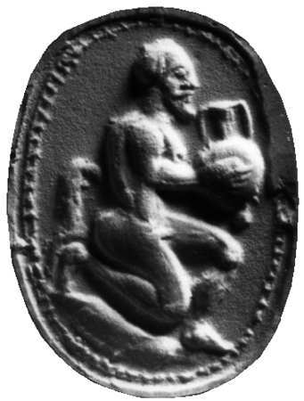 31/9 London no. 393, pl. 7, from Tharros. AG pl. 7.30. BH. Kneeling, with high stemmed kantharos. I