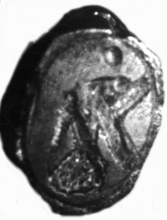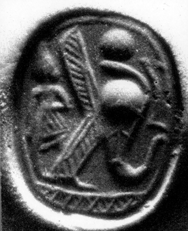 13/6 Istanbul 2493, from Sidon. Sard 281, pl. 157.2. BL;EXCR. Winged, disc-crowned, protecting a figure with pointed cap and kilt.