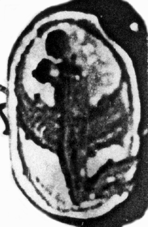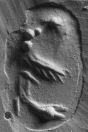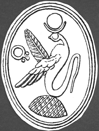 13/1 Spano Coll., from Tharros. Marmora, pl. A 2; Perrot, fig. 465; Hölbl, Sard no. 202. BL. Winged, with disc and horns crown, on a cross-hatched 'mountain'; sn ring in front? VI