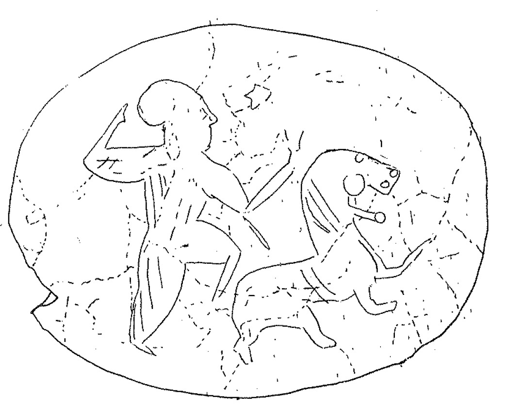 44/1 Albacete Mus. 7418, from Los Villares de Hoya Gonzalo, in a tomb with Attic 4th-century vases. Padro, New 35.01. Jaramago, Miguel (1996): "El escarabeo de los Villares (Hoya Gonzalo, Albacete)", Boletín de la Asociación Española de Orientalistas 26: 191-204.'Black'. A figure leaping forward with arms raised, a very large head; before it a lion moving away; star above. See the next.