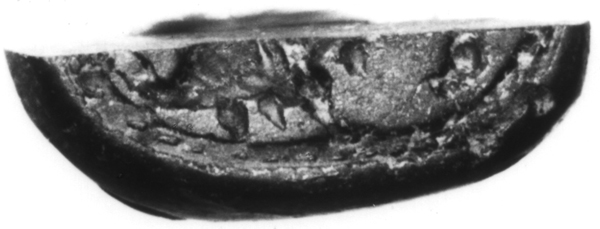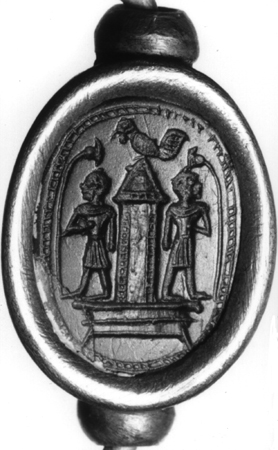 44/4 Tharros pl. 57c (BM ANE 133941), London no. 383, pl. 7; LRings no. 286. Hölbl, Sard no. 247. BH; in gold mount with wavy wire sides and hoop A. A tall gable-topped structure with a cock on it; flanked by two male figures; papyrus stalk at each side; all on a cavetto base. Tharros 101 on the possible relationship of the structure to Punic rather than eastern tomb monuments. I