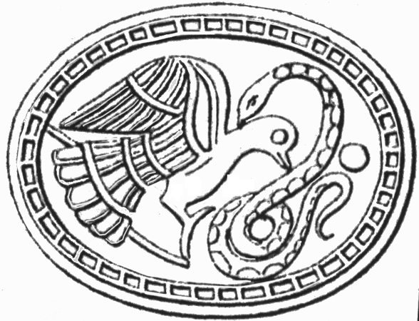 42/16 Ibiza no. 93 (New York no. 15, pl. 4; 31.11.14). BH. Forepart of Isis with horned-disc crown and both hands raised, palms out, attached to scorpion body with sickle wings. I