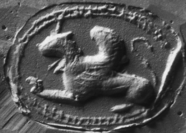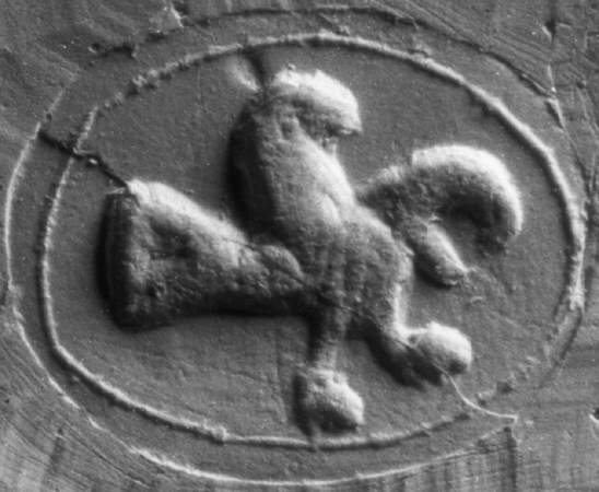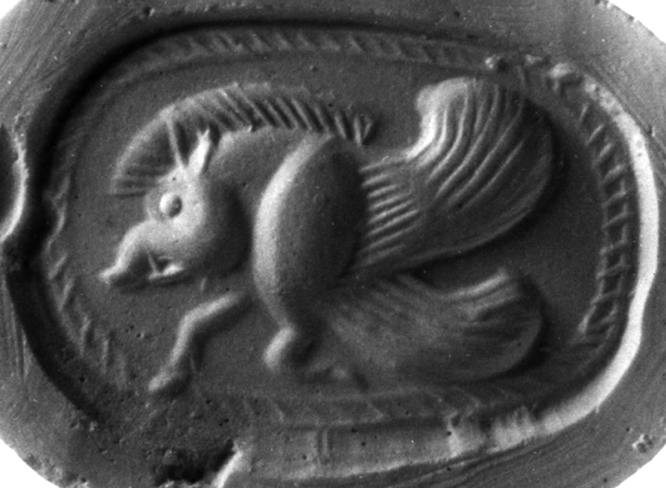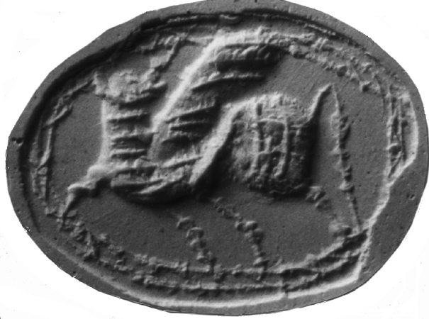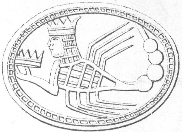 42/15 Pres.Ena Coll., from Tharros. Marmora, pl. B 105. BH. Forepart of crowned man (?) holding a tray (?) attached to the body of a scorpion.