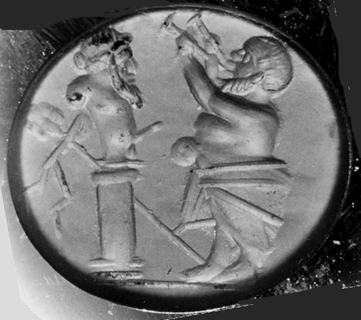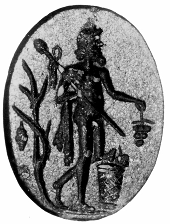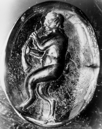 A plump silen with dress wrapped around his waist, is playing double pipes before a phallic body-herm on a pillar, with a thyrsos leaning against it. Ground line.